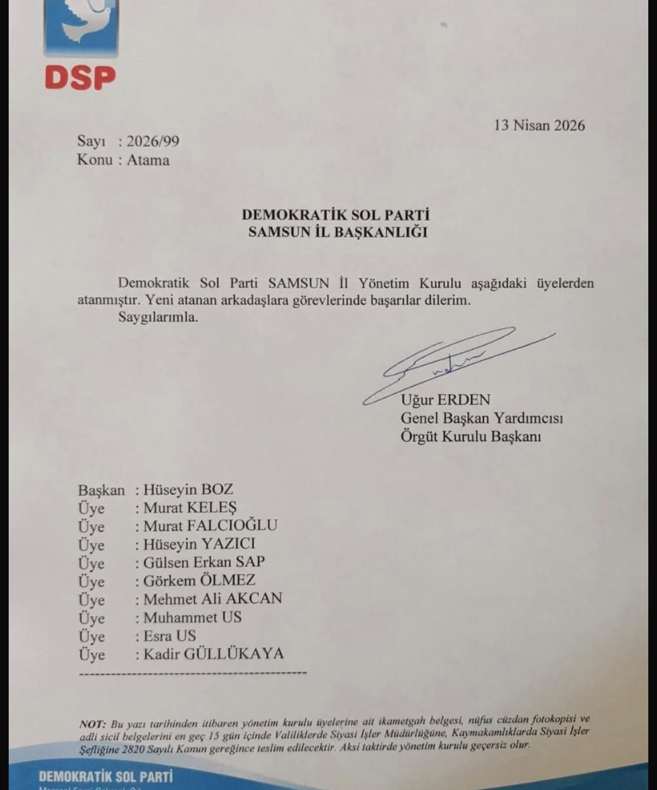 DSP’de yaşanan bu görev değişimi, Samsun siyasetinde yeni bir dönemin habercisi olarak yorumlanıyor.